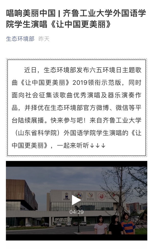 近日,生态环境部发布了六五环境日主题歌曲《让中国更美丽》2019领衔示范版,面向社会征集该歌曲优秀演唱及器乐演奏作品,并组织专业评委对征集的作品进行评选,择优在国家生态环境部官方微博、微信等平台陆续展播。外国语学院积极响应相关文件号召,以“唱响美丽中国”为主题,通过合唱的形式,以我校的优美校园环境为背景,展现了我校校园环境建设成果,录制了MV演唱视频并进行投稿,被国家生态环境部所采用,并在其官方微信公众号及微博推广。