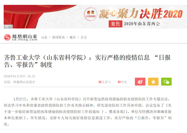 【凤凰网】齐鲁工业大学(山东省科学院):实行严格的疫情信息 “日报告、零报告”制度