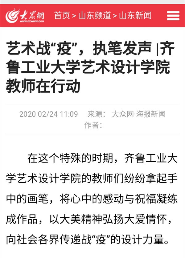 【大众网】艺术战“疫”,执笔发声 |齐鲁工业大学艺术设计学院教师在行动