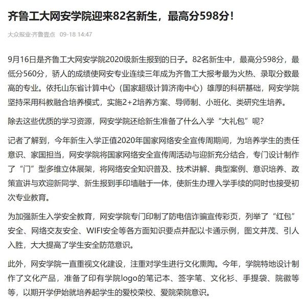 【大众报业·齐鲁壹点】齐鲁工大网安学院迎来82名新生,最高分598分!